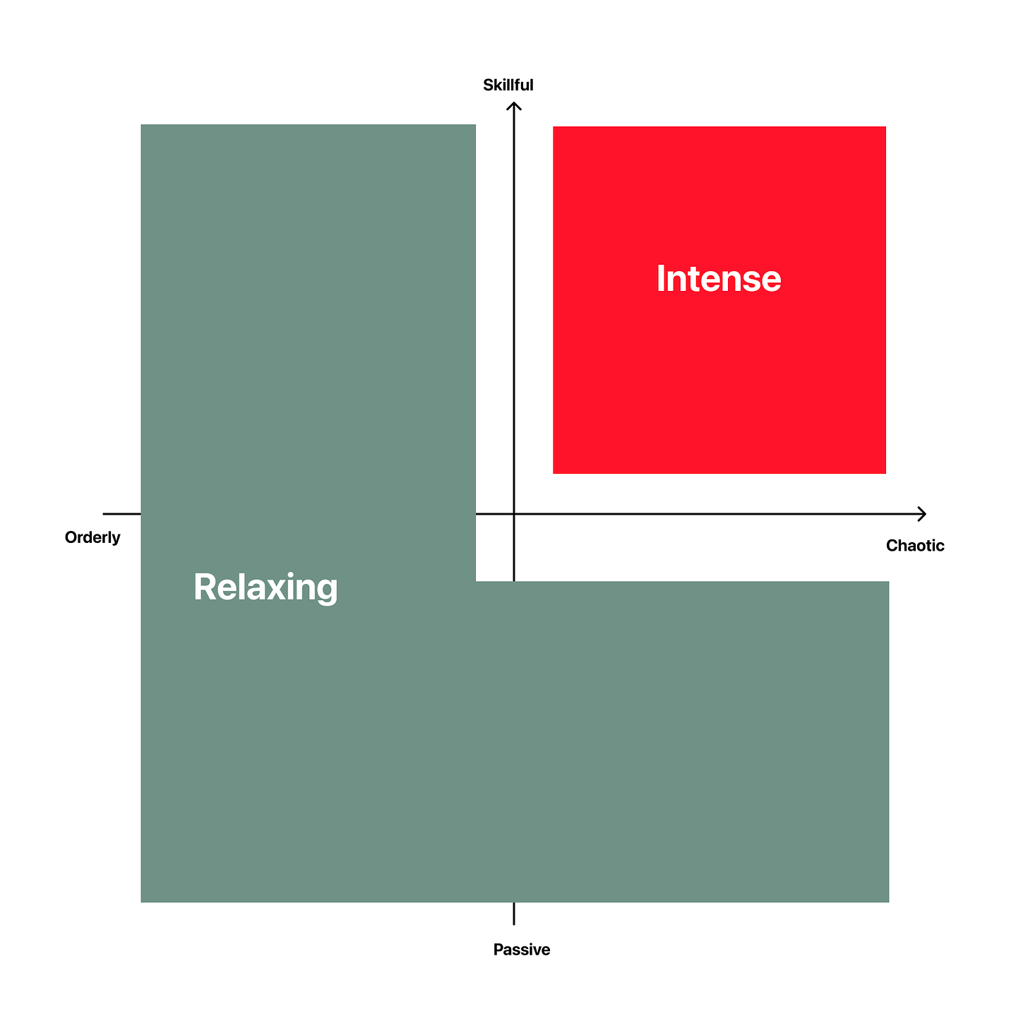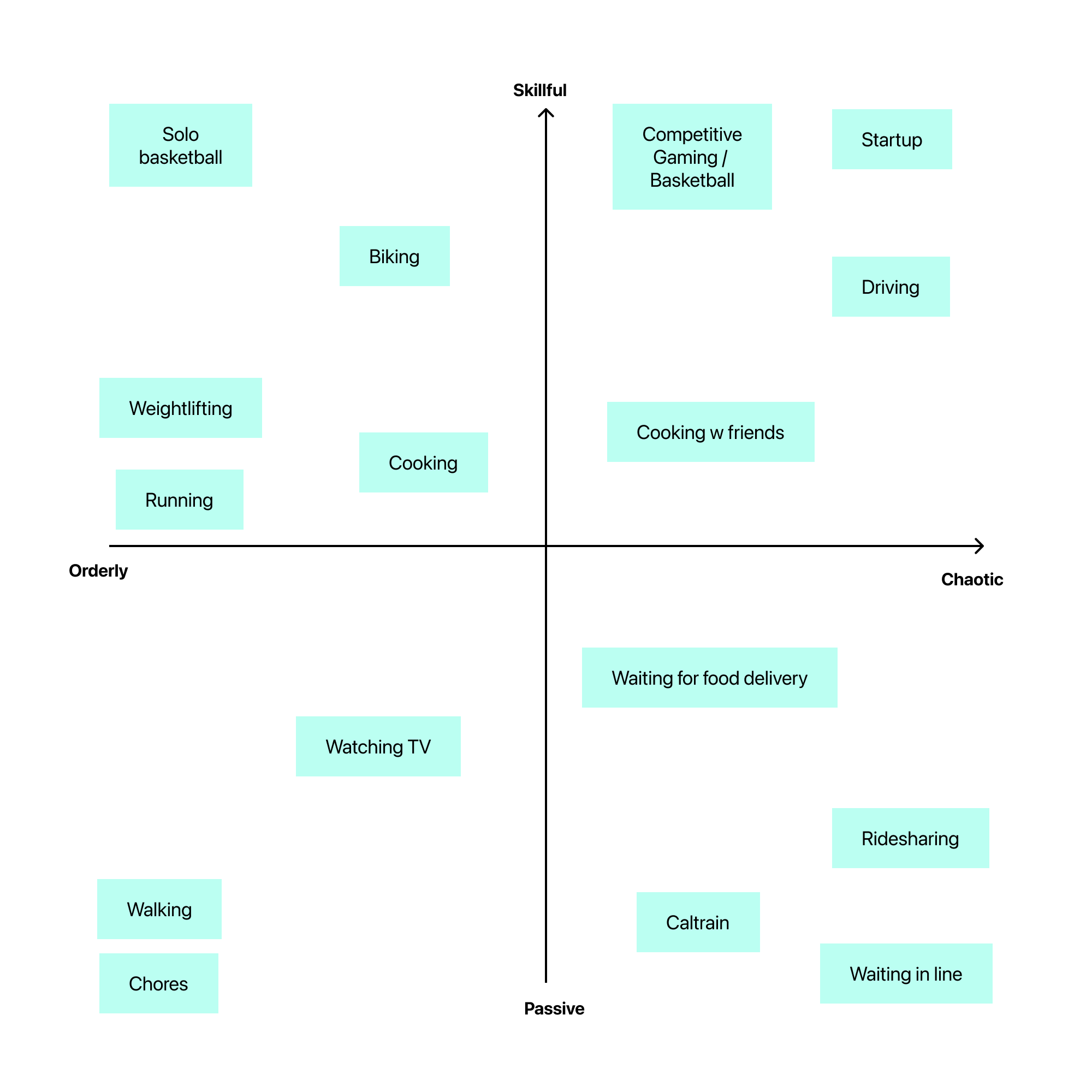 On the x-axis, it goes from orderly to chaotic. On the y-axis, it goes from passive to skillful. I mapped out a bunch of regular activities I regularly engage in throughout the week. Each activity has its own purpose, including commutes, walking, chores, etc. Some replenish, others deplete. Some stress, some relax.